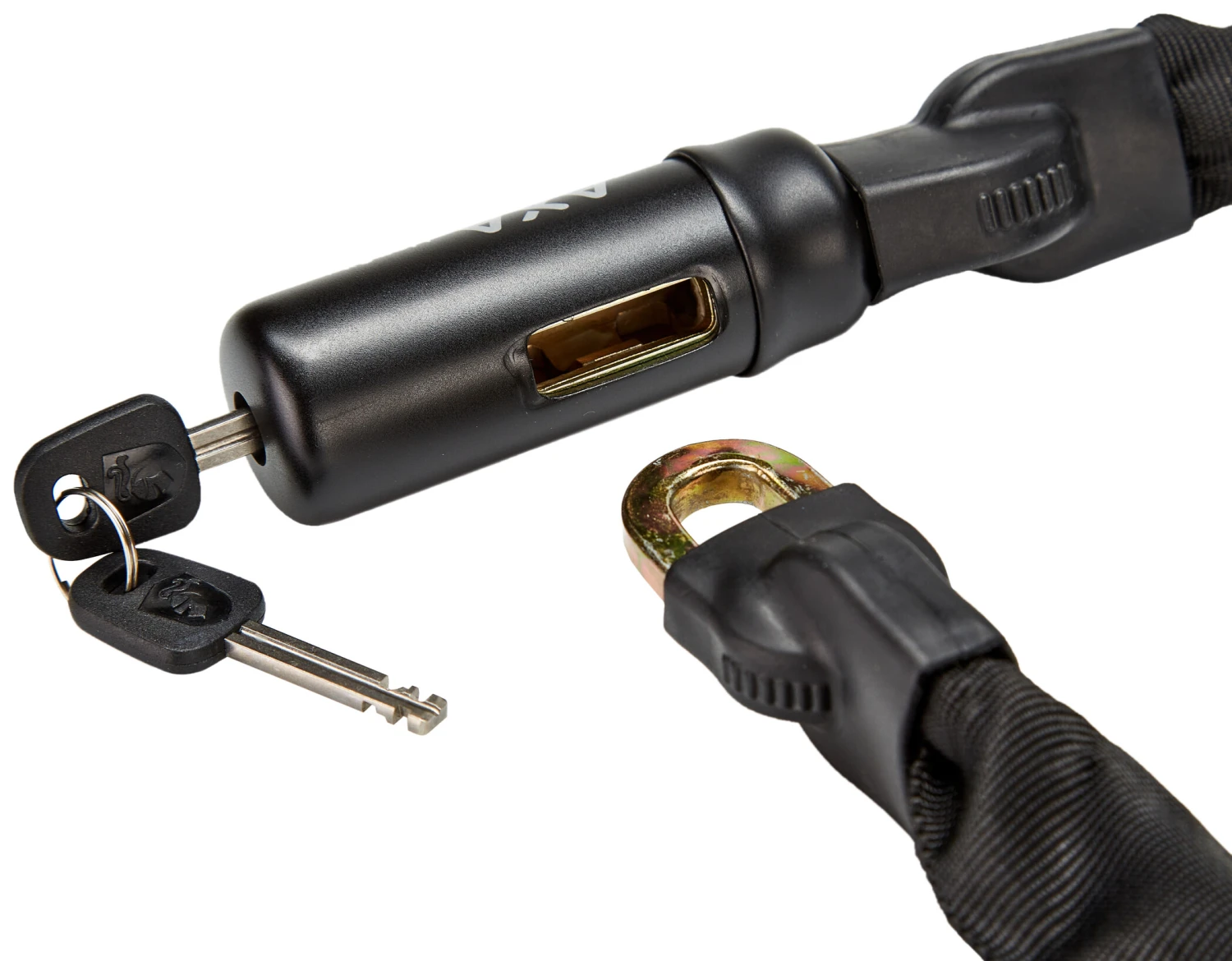 Le mécanisme de verrouillage à fonctionnement souple est actionné par une clé symétrique, quel que soit le côté de la clé que vous insérez dans la serrure. Le dernier maillon de chaîne est fixé dans le boîtier de la serrure par un « pêne dormant » pour une liaison particulièrement sûre.