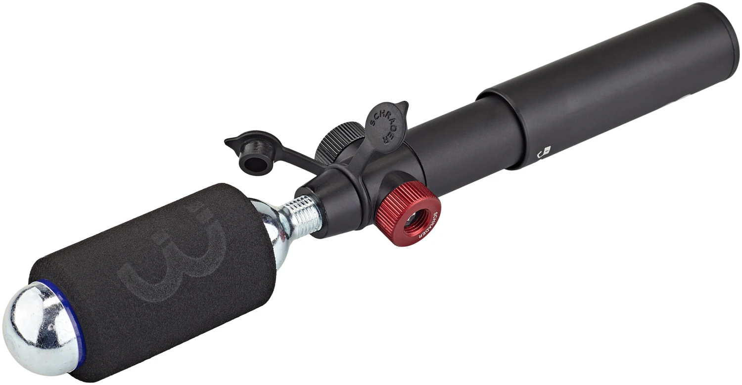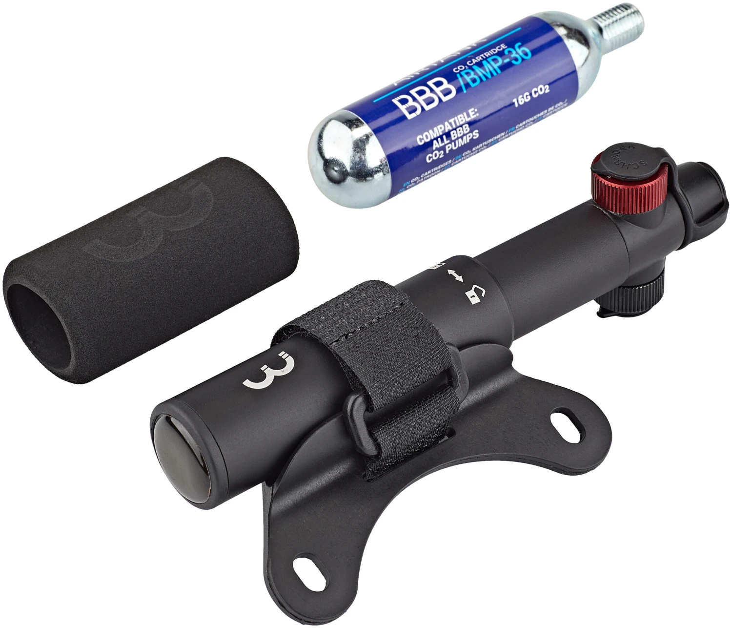 Le BBB Co2 Blaster est un gonfleur à cartouche de CO2 combiné à une mini pompe en aluminium mince, élégante et légère. Le système de verrouillage empêche la poignée de glisser vers le bas.