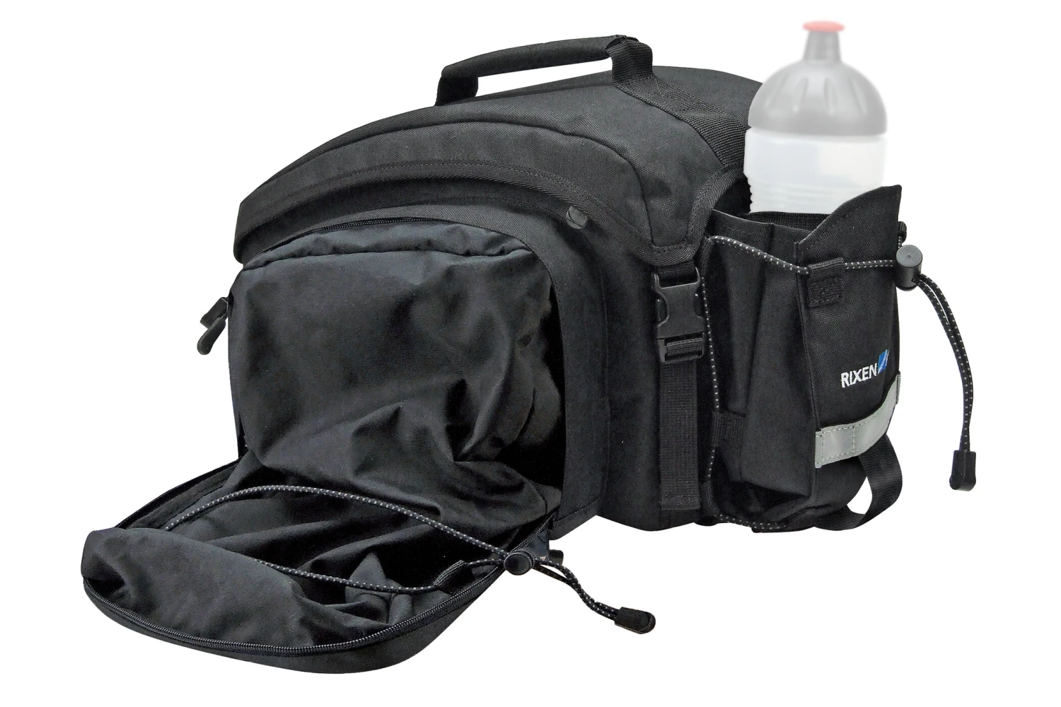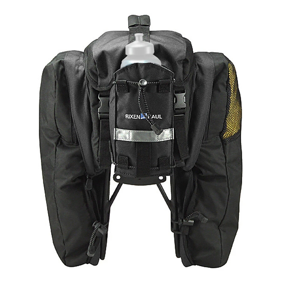 Sacoche à renfort mousse sur tout le tour. Avec beaucoup d’espace supplémentaire grâce à ses larges poches latérales dépliables. Compartiment principal avec zip double et un rabat sous lequel vous pouvez stocker votre veste ou votre pull. Comprend une bande réfléchissante, un support pour éclairage, une poignée, une protection de pluie et une sacoche porte bidon rétractable à l’arrière. (Astuche: A n’utiliser qu’avec les porte-bagages avec supports latéraux.)