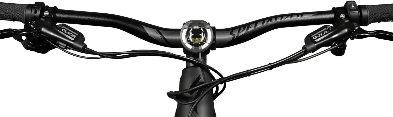 Le faisceau de croisement de la SL F est conçu d’après le modèle d’un projecteur de voiture et est absolument sans éblouissement pour les usagers de la route venant en sens inverse. Le feu de route de 1300 lumens du SL n’est pas simplement un faisceau de croisement plus puissant. Il suffit d’appuyer sur un bouton pour que la luminosité change et éclaire une zone supplémentaire, bien au-dessus de la ligne de coupure et sans éblouir : Parfait pour les randonnées rapides et les sentiers exigeants. Contrairement aux autres systèmes d’éclairage de bicyclette homologués StVZO, l’image lumineuse de la SL F ne se limite pas à une petite bande, mais évoque un tapis lumineux large et homogène directement devant votre roue avant.