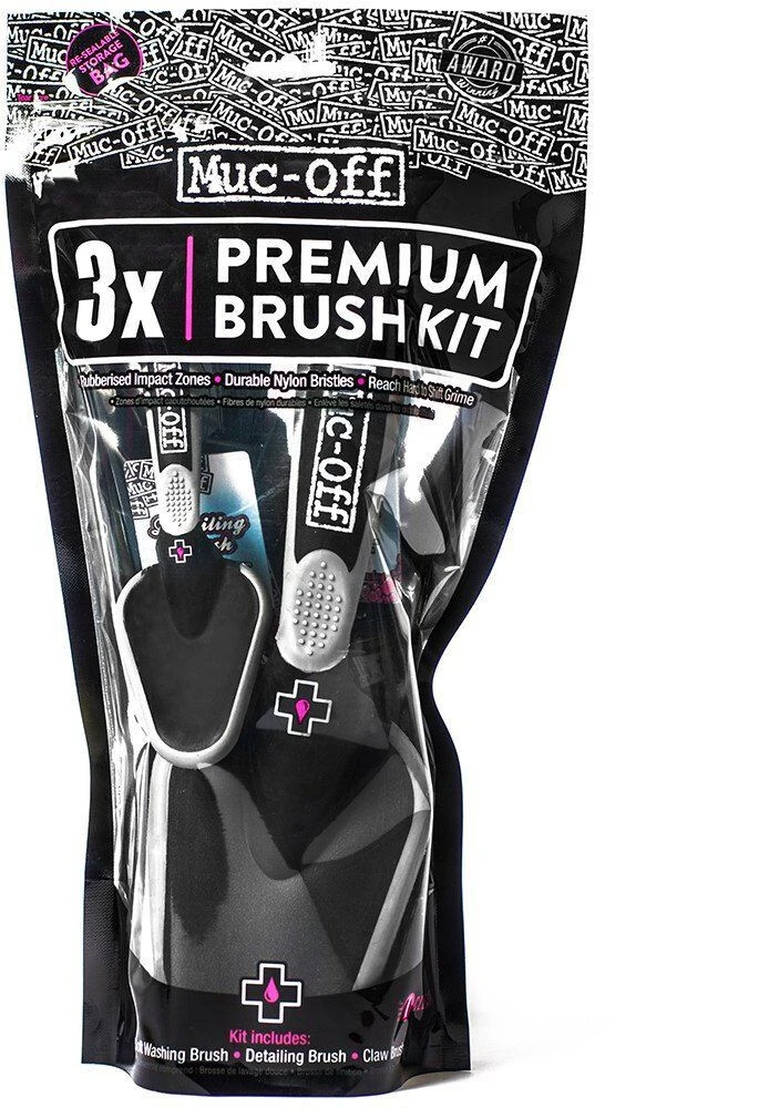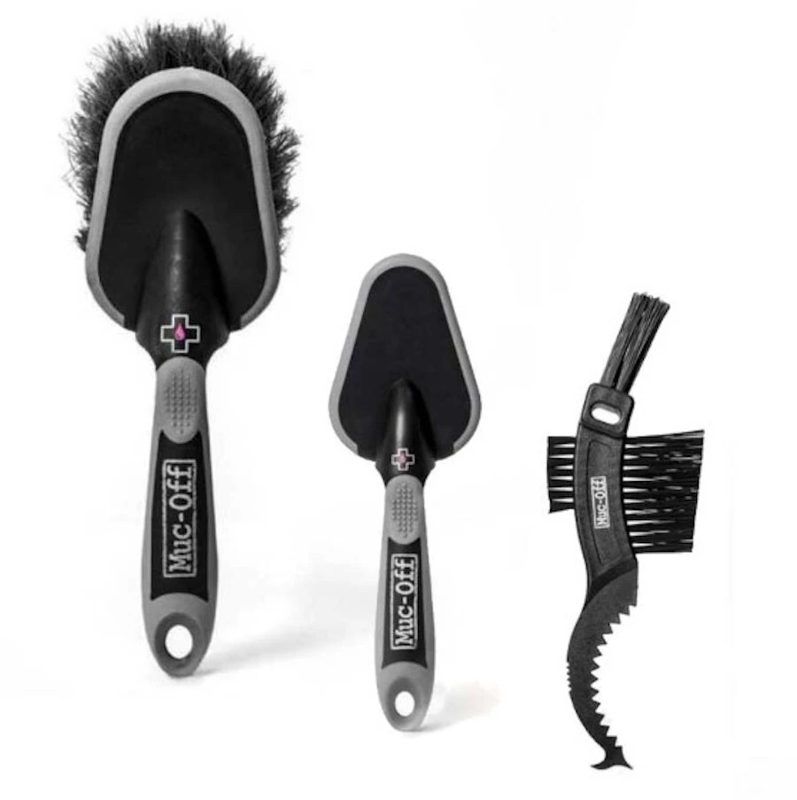 Ce kit de brosses MUC-OFF comprend : – Une brosse de 55 mm avec finition soyeuse pour nettoyer le cadre de votre vélo, les composants et équipements tout en prenant soin de ces pièces et en accédent aux finitions difficiles. – Une brosse de 35 mm, idéale pour nettoyer les moyeux, les petits recoins du cadre, les arceaux de fourche et de suspension. – Une brosse en forme de griffe avec texture spéciale et poils en mylon, elle est idéale pour les cassettes, chaines et transmission.