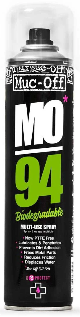Vous cherchez LE spray miracle universel ? Le voici ! Le Muc-Off MO-94 balaye large avec son incroyable formule PTFE : il passe à travers l’eau rapidement et efficacement, lubrifie les pièces mobiles et laisse un film protecteur durable. Le MO-94 empêche les dépôts de saleté et déplace l’eau pour réduire la rouille et la corrosion. En outre, il peut être utilisé dans la vie quotidienne pour les portes qui grincent, les serrures rouillées ou les vis bloquées. Le MO-94 serait peut-être juste tout ce dont vous avez besoin… Remarque : N’utiliser ni sur le profil des pneus ni sur les surfaces de freinage !
