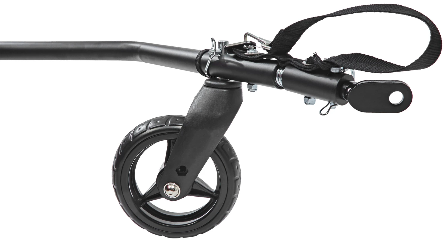 - Roue avant 6″ incluse (pour utiliser la remorque sans vélo)