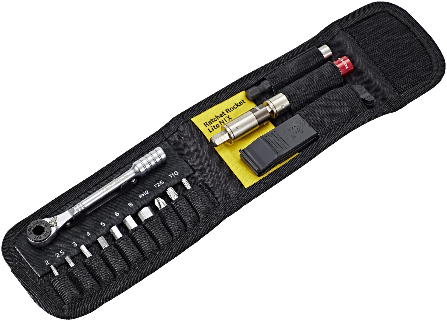 La mini clé à cliquet Ratchet Rocket Lite NTX de Topeak offre tout ce dont vous avez besoin pour réparer la plupart des petits problèmes en déplacement. Avec mécanisme à dents fines précis, levier à pouce pour changer le sens de marche et Nano TorqBits pour un réglage précis du couple correct. Avec porte-embouts magnétique, embouts (douille hexagonale de 2 / 2,5 / 3 / 4 / 5 / 6 / 8 mm, T10 / T25 Torx, 2 Phillips), deux démonte-pneus et sac de transport pour une organisation claire et un transport sûr.