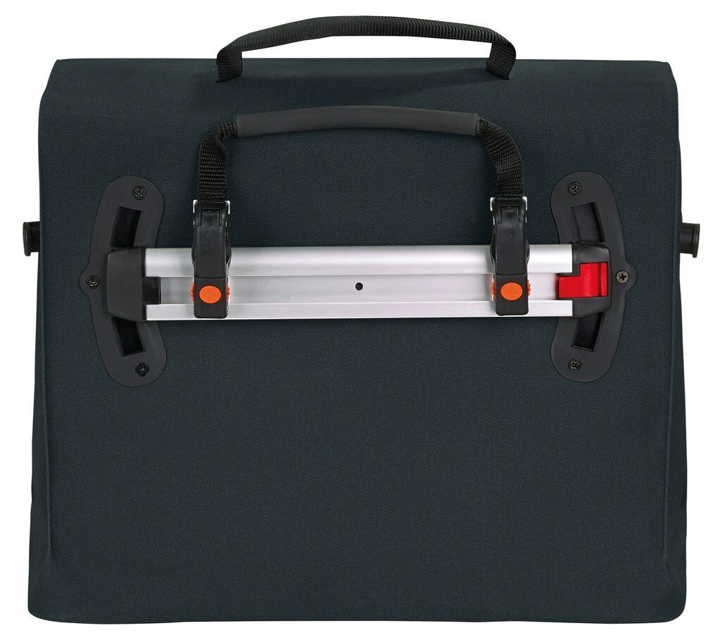 Extra Vagant : le grand sac de la roue arrière au look textile robuste ressemble plus à une mallette qu’à un sac de vélo. Totalement exempt de PVC, mais soudé de manière étanche, le sac de transport « Made in Germany » avec rail de fixation réglable Plug and Ride convainc de plus en plus de passionnés de vélo. Grâce au rembourrage supérieur à la moyenne dans le compartiment intérieur, rien ne peut arriver à un ordinateur portable ou à des documents de format A4. Même une collision avec le sol est absorbée par de petits « pieds » et offre un support parfait. Une poignée de transport et des bretelles confortables permettent de se rendre au travail même sans le vélo.