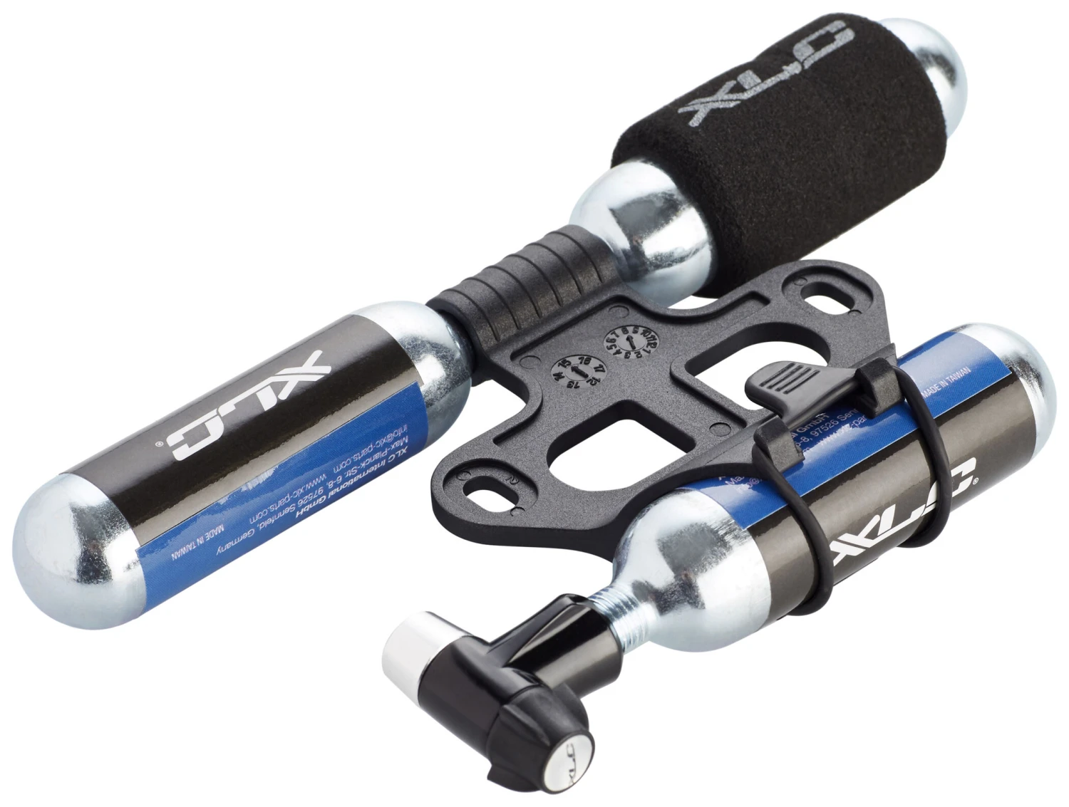 La pompe à cartouche est équipée d’une tête de pompe en aluminium robuste et optimisée en poids, de deux cartouches de rechange de 16 g et d’une cartouche spéciale de 16 g avec protection EVA. La pompe à cartouche XLC convient à tous les types de valves et est fournie avec un support pour deux cartouches de rechange.